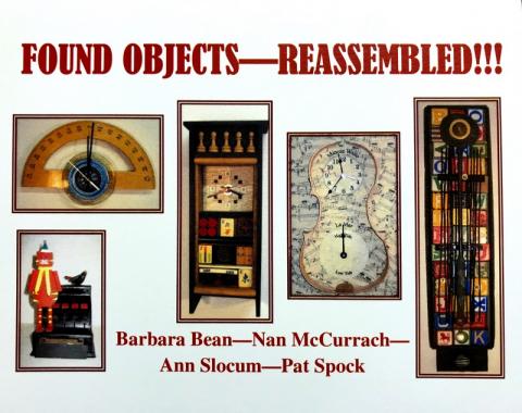 Found Objects - Reassembled is a collection of assemblages made from objects gathered by 4 area artists: Barbara Bean and Ann Slocum from Points of View Artists and their friends Nan McCurrach and Pat Spock. These whimsical combinations of ordinary objects tell interesting stories of their own, using common objects like sheet music, childrens blocks, game pieces, and ordinary tools. As an added bonus, some are even working clocks.