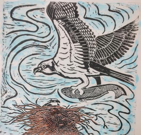 hand-colored linocut print 12X12"
